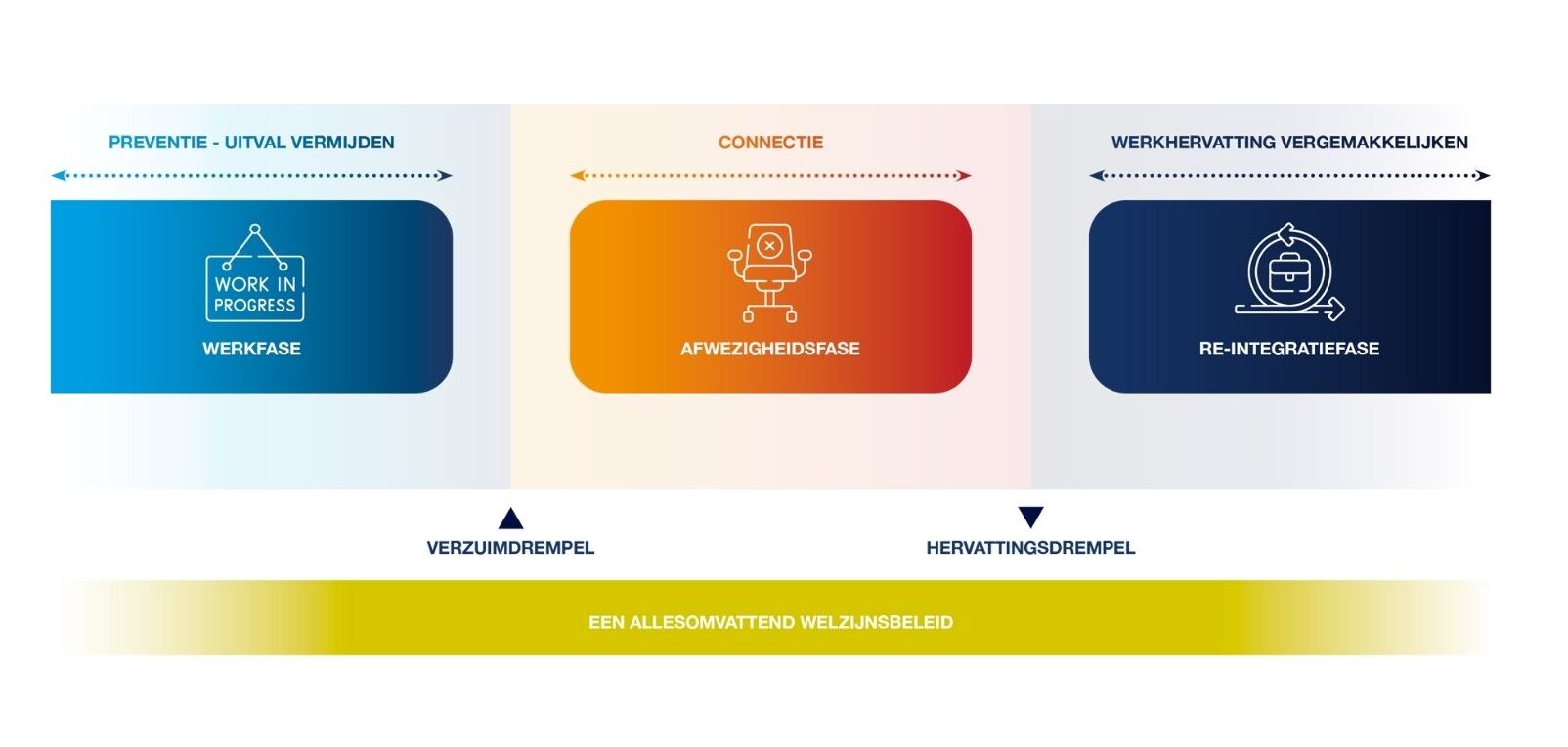 In de werkfase is de medewerker actief aan het werk. Deze fase staat volledig in het teken van preventie: uitval vermijden door tijdig signalen op te vangen en gezondheid en welzijn op te volgen. Denk aan periodieke gezondheidsbeoordelingen, spontane raadplegingen en gerichte preventieve adviezen. Door hier te investeren, verlaag je de kans dat klachten escaleren en werknemers uitvallen.